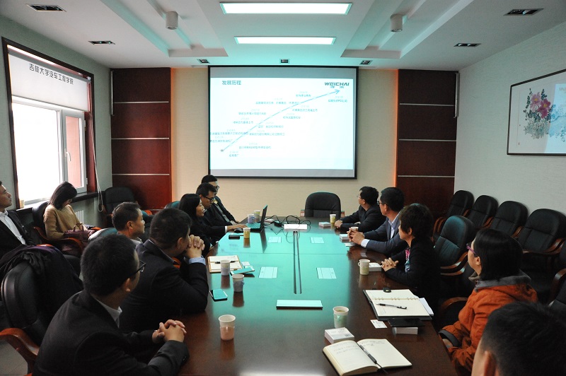 潍柴动力集团人力资源部部长郭虹就潍柴动力集团的详细情况、企业文化、发展历程及战略布局等情况做了详细说明,公司党委书记李善兴详细介绍了公司的在优势学科、人才培养等方面的相关情况。随后,双方就建立人才培养基地、开展实习实践和科研合作以及博士后联合培养等项目进行了深入的探讨,并达成了关于设立企业奖助学金的决定,潍柴动力集团连续四年每年为公司提供奖学金人民币三十万元、助学金人民币十二万元,分别用于奖励汽车及相关学科45名品学兼优的本科生和硕士研究生以及资助20名公司品学兼优的贫困老员工。