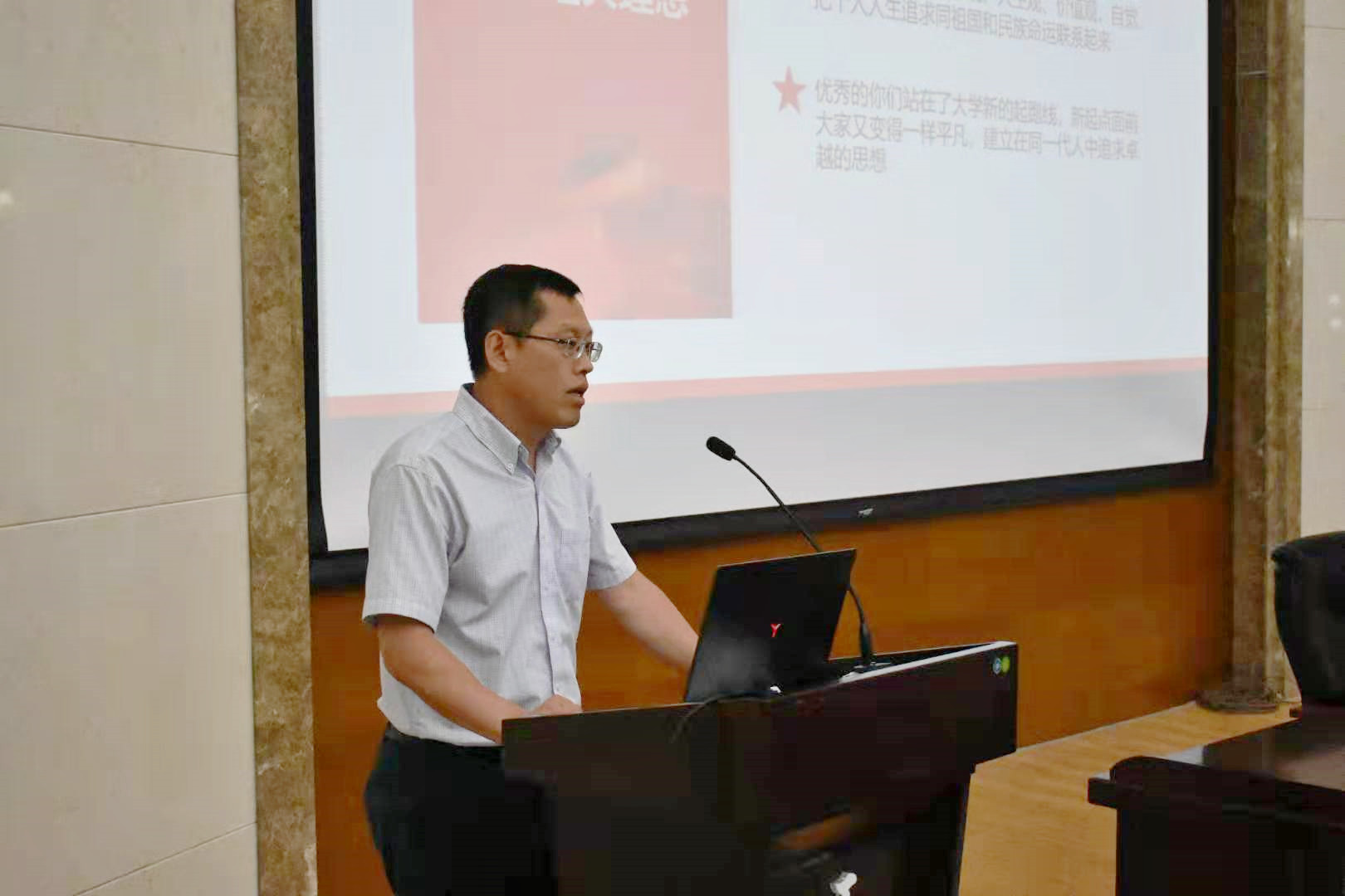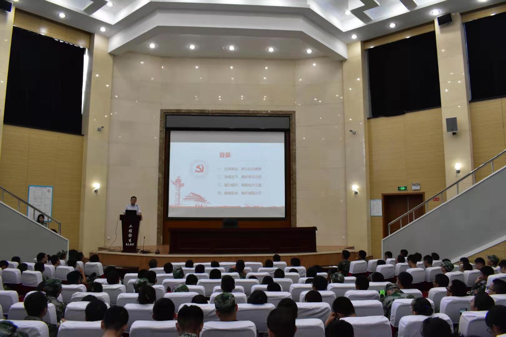 9月4日,在南岭校区仿生楼报告厅,汽车工程公司党委书记李善兴为全体新生上第一堂党课,勉励新入学员工坚定理想信念,展现青春力量。