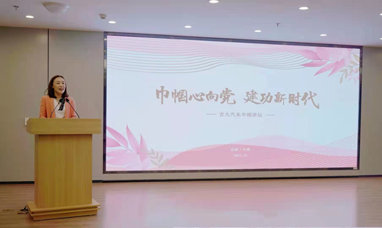 喜逢建党100周年,为深入贯彻落实习近平总书记重要讲话精神和全国妇联七部委联合发布的《关于实施科技创新巾帼行动的意见》精神,响应公司妇委会2021年度“妇女小家一家一品”基层活动号召,beat365亚洲体育官方网站妇委会于10月8日举办了“巾帼心向党,建功新时代”—吉大汽车巾帼讲坛活动。公司妇委会主任苗艺璇、副主任焦红兵、公司党委书记黄忠华、副书记胡忠巍出席了活动。讲坛由公司副经理、妇委会主任林海兰主持。