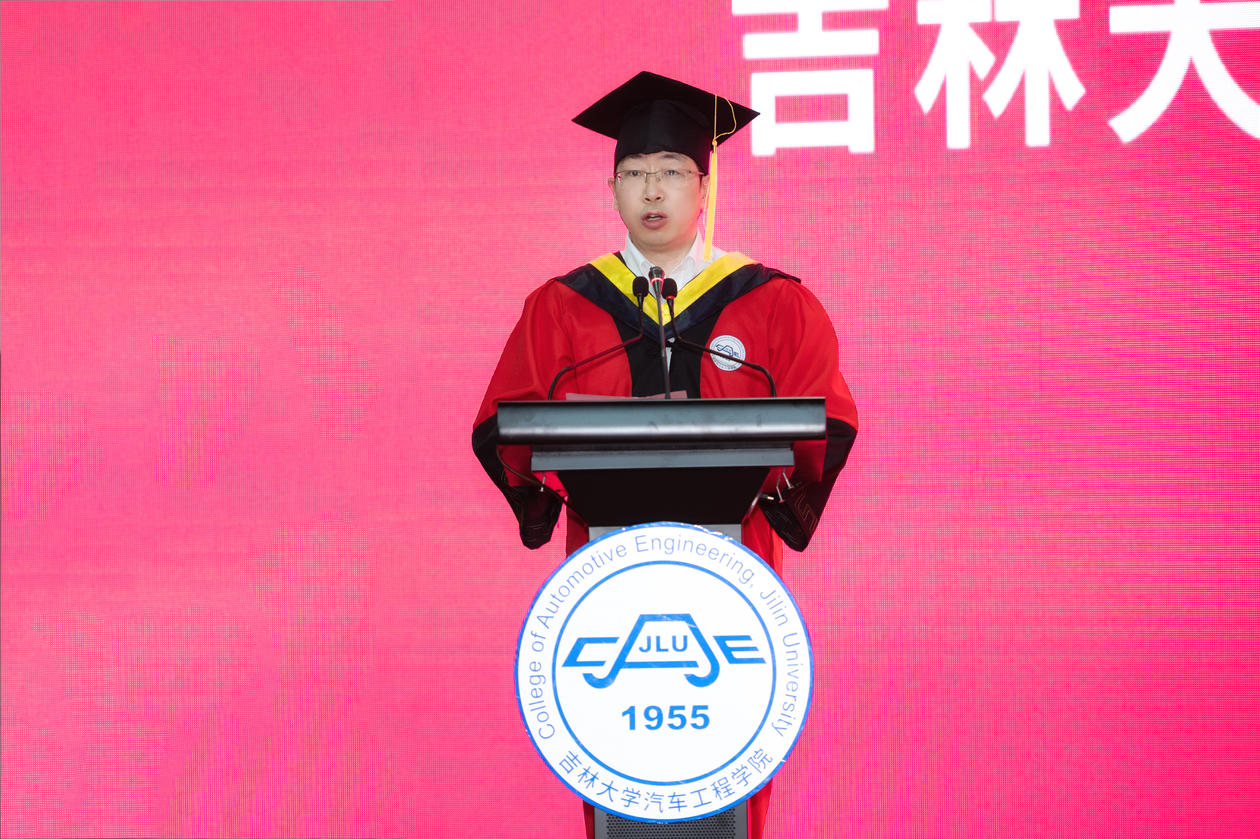 随后,经理高振海教授致辞。在讲话中他提到今年的毕业季由于疫情注定不平凡,云上毕业典礼也是史无前例,但改变的只是方式,不变的是对大家的祝福与期待。他与大家一起回顾了员工们入学以来的成长经历和各方面取得的优异成绩,极大地肯定了员工在思想建设、学业成就、学术创新、车队竞赛荣誉等各方面的亮眼表现。在临行之际,高经理对毕业生提出三点祝愿。一是希望大家坚守初心,怀揣理想,做习近平新时代中国特色社会主义思想坚定的信仰者、忠实的实践者,在中华民族伟大复兴进程中谱写激昂的青春乐章。二是希望大家回首过往,收获成长,勇敢地迎接风雨的洗礼,在困厄的境遇面前不坠青云之志,在历经沧桑之后不失赤子之心。三是希望大家饮水思源,服务社会,能够扛起大旗,承担起这一代应负的社会责任和道德责任,尽己所能去孝敬父母、回报母校、回馈社会。在讲话的最后祝福同学们,鹏程万里,前途远大,在自律自省中完善小我,在拼搏奉献中铸就大我。