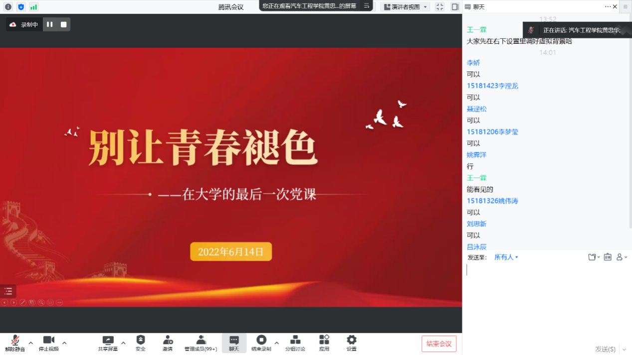 为教育和引导全体毕业生自觉增强党员意识、勇挑重担,充分发挥党员的引领示范作用,今后在各行各业努力成为楷模和榜样,6月14日下午,beat365亚洲体育官方网站举行了以“别让青春褪色”为主题的毕业生最后一次党课。受疫情影响,本次活动通过腾讯会议在线上举行。汽车工程公司党委书记黄忠华、公司相关科室老师及2022届本科毕业生党员参加了本次活动。活动由2018级本科辅导员李娇老师主持。