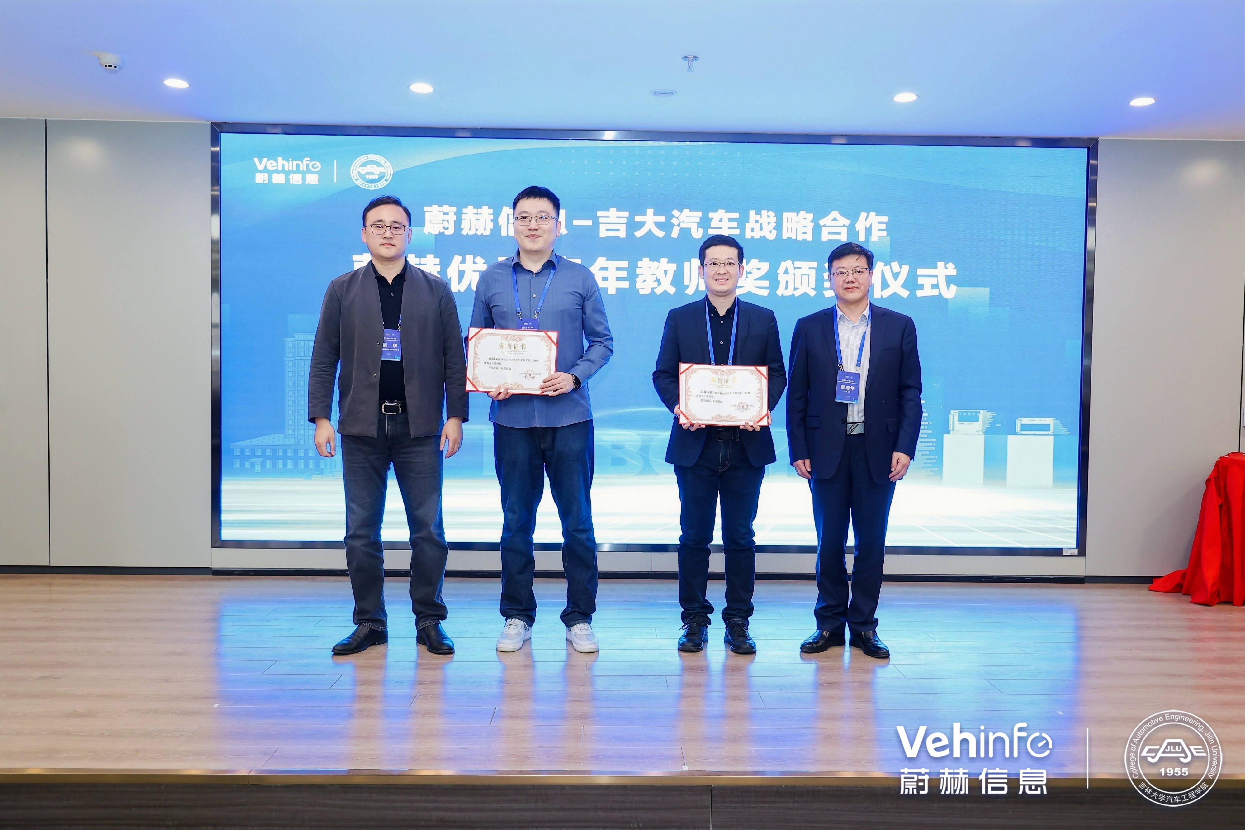 公司副经理王忠恕与蔚赫信息副总经理虢华为吉大蔚赫联合试验室揭牌;公司党委书记黄忠华与蔚赫信息副总经理虢华共同为公司获得“蔚赫”优秀青年教师奖的两位教师颁发荣誉证书。