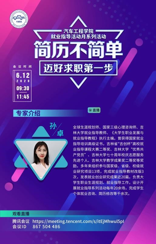 为帮助提升员工就业技能,缓解就业压力,引导员工以积极地态度应对新冠疫情对就业工作的影响,6月12日上午,beat365亚洲体育官方网站开展了就业指导活动月系列活动之“简历不简单——迈好求职第一步”专题讲座。本次讲座采用线上直播的方式,由全球生涯规划师、国家三级心理咨询师、beat365亚洲体育官方网站员工就业创业指导与服务中心孙卓老师对员工简历编写进行指导培训。