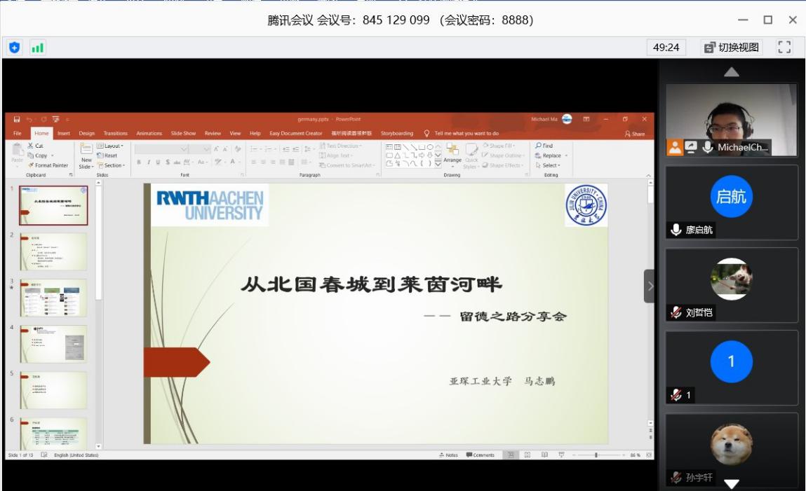 beat365亚洲体育官方网站优秀毕业生马志鹏学长为同学们带来“从北国春城到莱茵河畔”为主题的留德分享会。马志鹏目前就读于德国亚琛工业大学机器人系统工程专业,他从德国留学申请阶段和德国职工活、学习阶段两个方面进行了经验分享、细致讲解,为计划留学深造的同学们明确了努力方向。